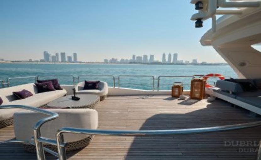 The flybridge also comes equipped with a shaded area, ensuring guests can relax in comfort during the sunny hours. Whether you’re soaking in the breathtaking views of the Burj Al Arab or cruising toward the horizon, the flybridge guarantees an unforgettable experience.